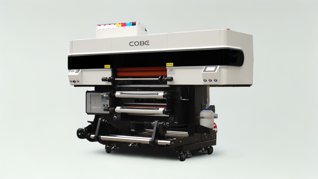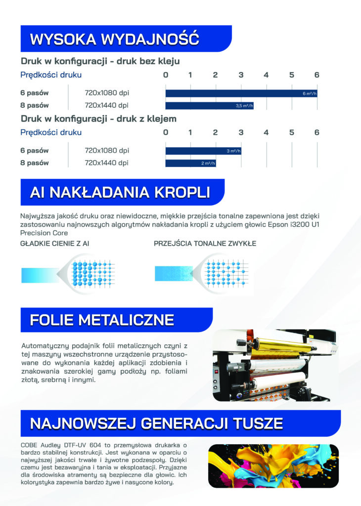 Profesjonalna drukarka DTF UV, z możliwością druku klejem, w trybie kolor – biały – kolor. Wyposażona w standardzie w automatyczny system wykonywania aplikacji z użyciem folii metalicznych (hot stamping).